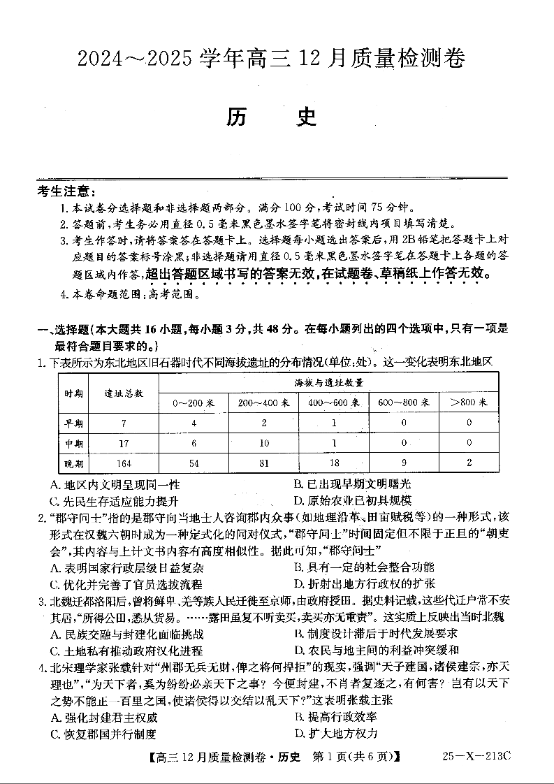 山西省卓越联盟区域高中2025届高三12月质量检测历史