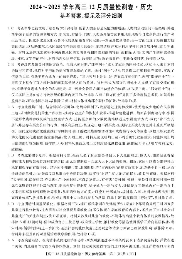 山西省卓越联盟区域高中2025届高三12月质量检测历史答案
