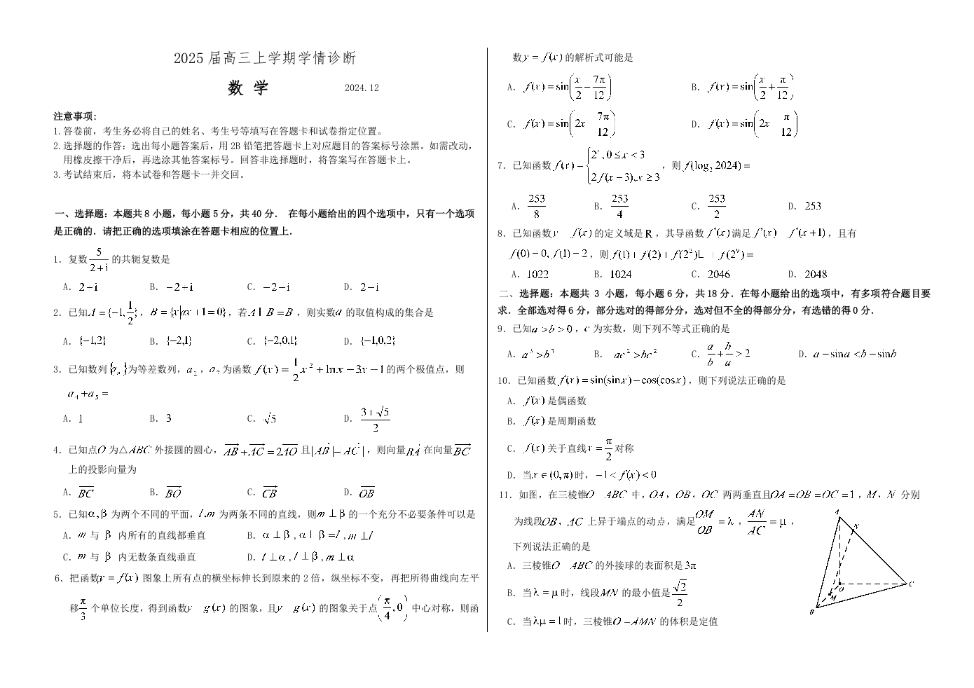 山东省区域高中联考2025届高三上学期12月学情诊断数学