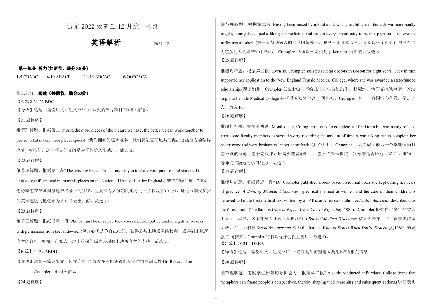 山东省区域高中联考2025届高三上学期12月学情诊断英语答案解析