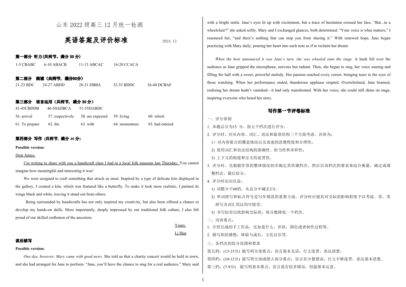 山东省区域高中联考2025届高三上学期12月学情诊断英语答案评分标准