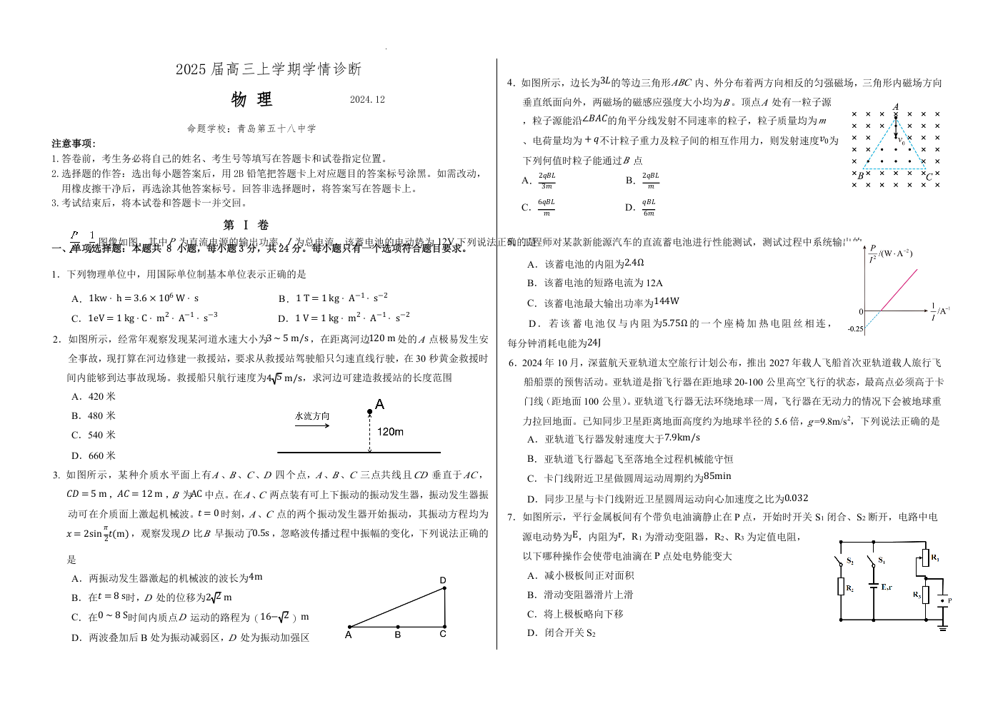 山东省区域高中联考2025届高三上学期12月学情诊断物理