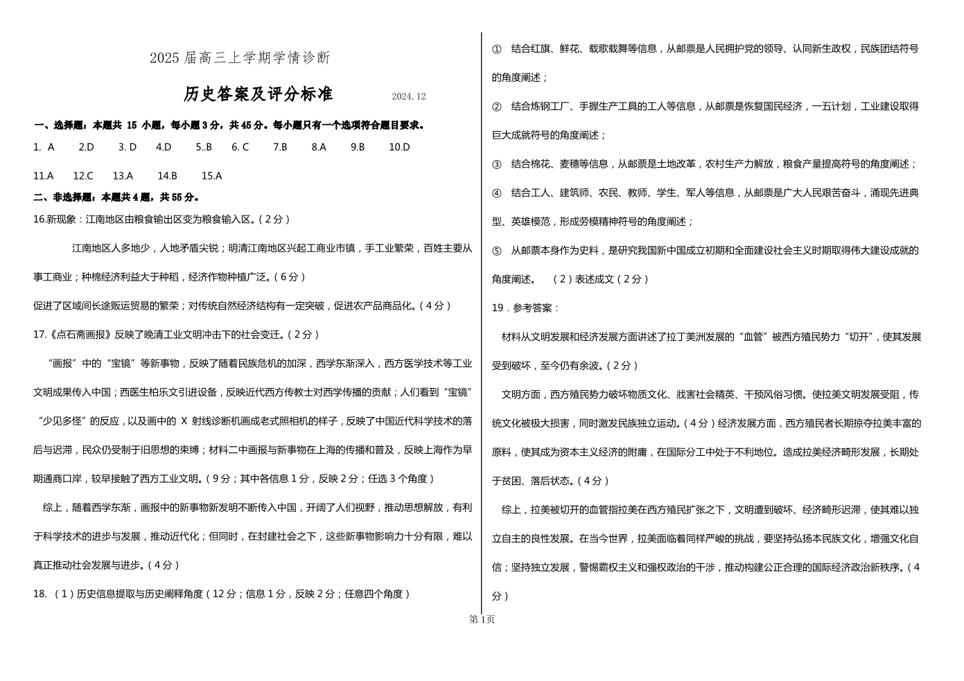 山东省区域高中联考2025届高三上学期12月学情诊断历史答案评分标准
