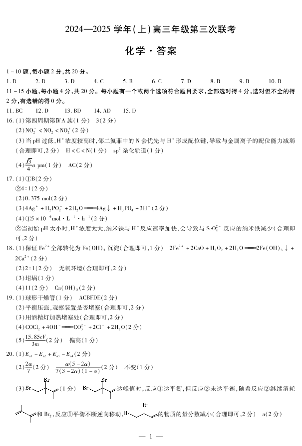 山东省齐鲁名校联盟2025届高三年级上学期第三次联考化学答案