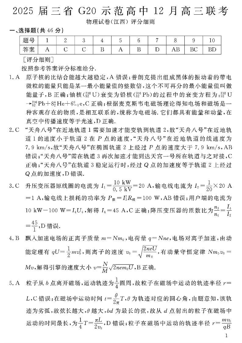 豫赣疆三省G20示范高中2025届高三上学期12月联考物理答案