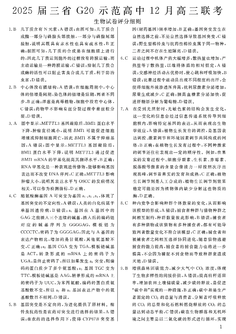 豫赣疆三省G20示范高中2025届高三上学期12月联考生物答案