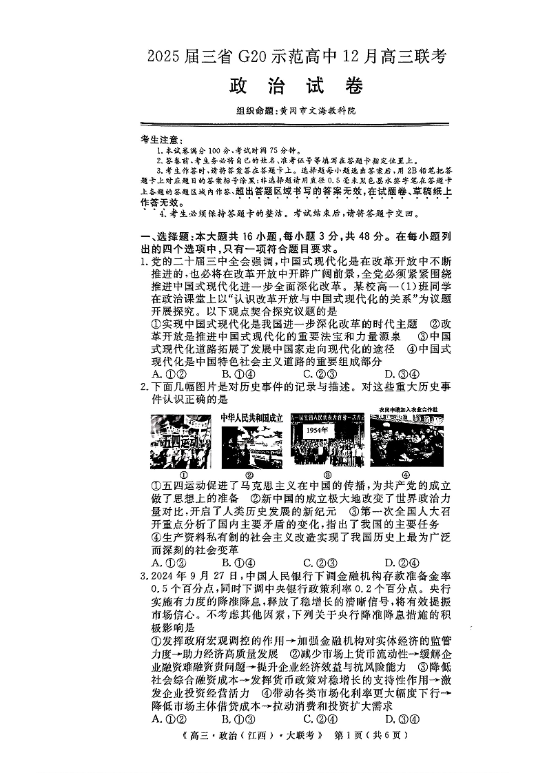 豫赣疆三省G20示范高中2025届高三上学期12月联考政治+答案
