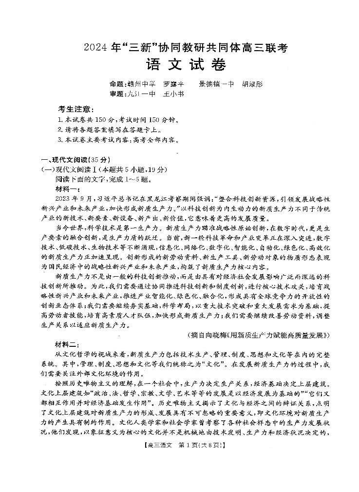 江西省“三新”协同教研共同体名校2025届高三上学期12月联考语文