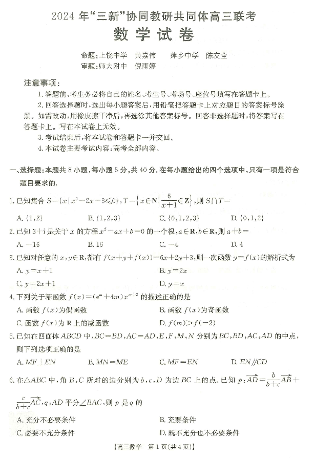 江西省“三新”协同教研共同体名校2025届高三上学期12月联考数学
