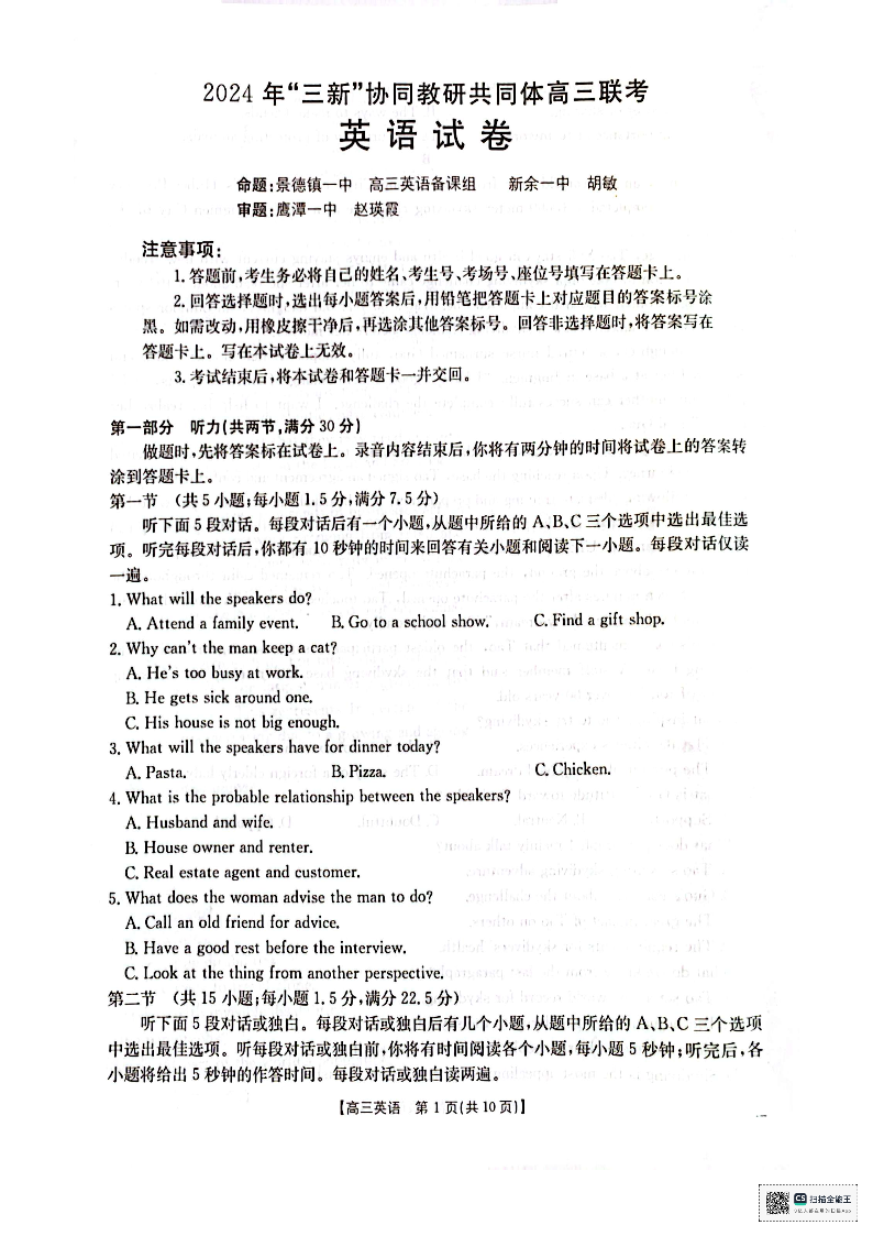 江西省“三新”协同教研共同体名校2025届高三上学期12月联考英语