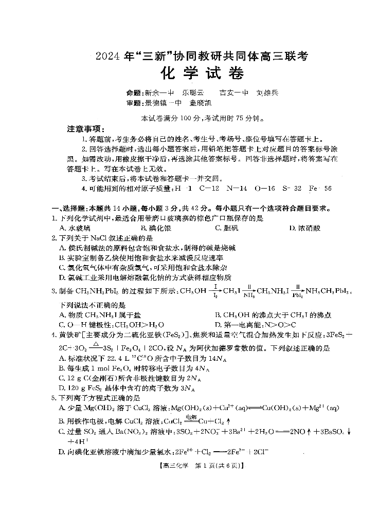 江西省“三新”协同教研共同体名校2025届高三上学期12月联考化学