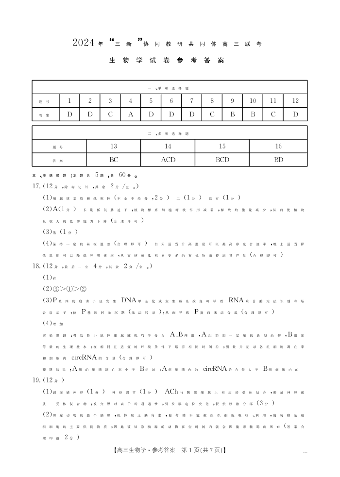 江西省“三新”协同教研共同体名校2025届高三上学期12月联考生物答案