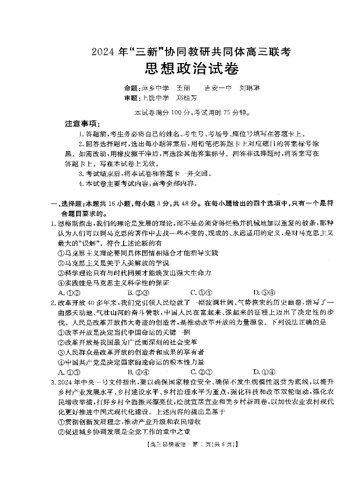 江西省“三新”协同教研共同体名校2025届高三上学期12月联考政治