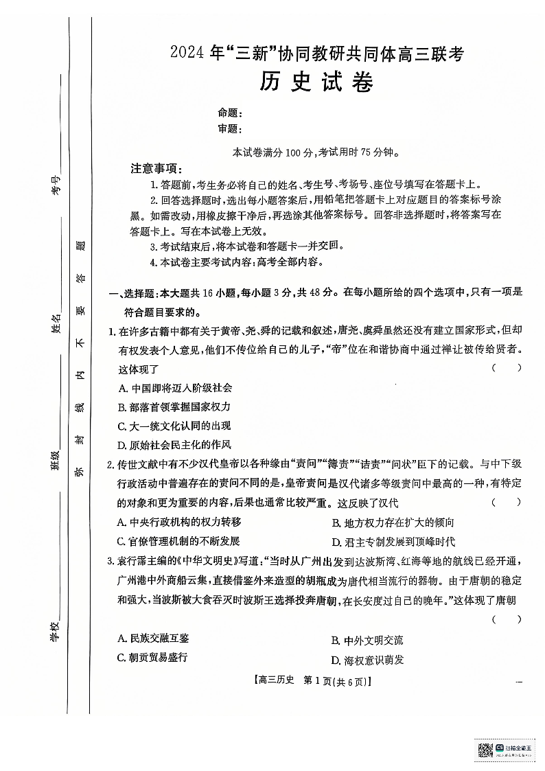 江西省“三新”协同教研共同体名校2025届高三上学期12月联考历史