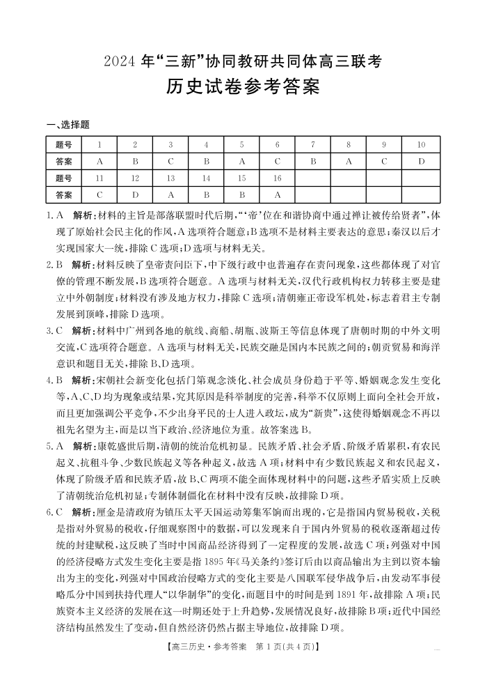 江西省“三新”协同教研共同体名校2025届高三上学期12月联考历史答案