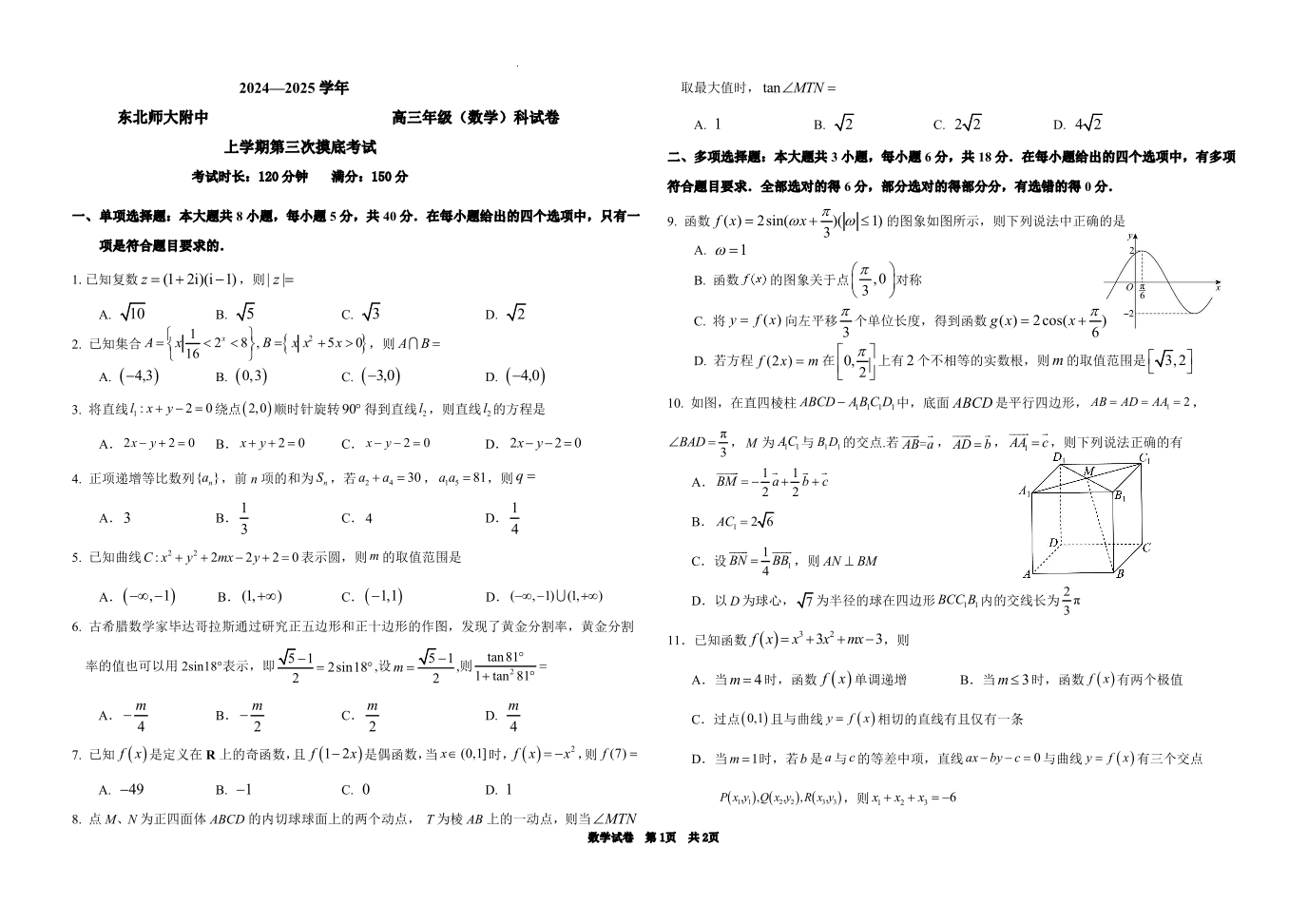 吉林省东北师大附中2025届高三上学期第三次模拟考试数学