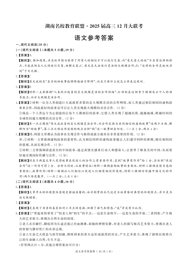 湖南省名校教育联盟2025届高三上学期12月大联考英语答案