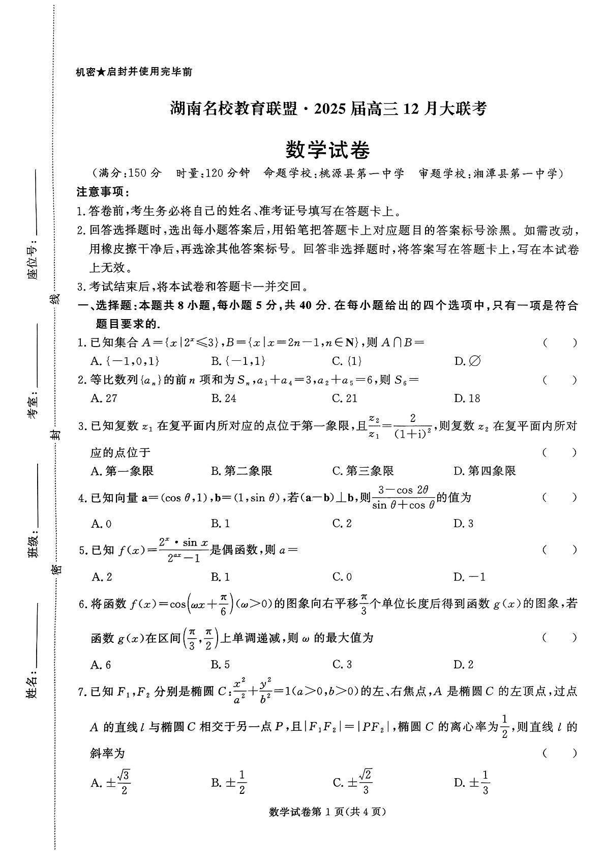 湖南省名校教育联盟2025届高三上学期12月大联考数学