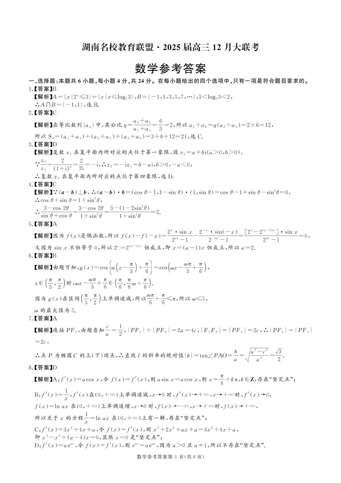 湖南省名校教育联盟2025届高三上学期12月大联考数学答案
