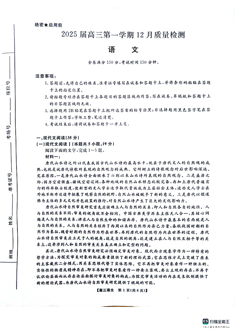 河南省华师联盟2025届高三第一学期12月质量检测语文