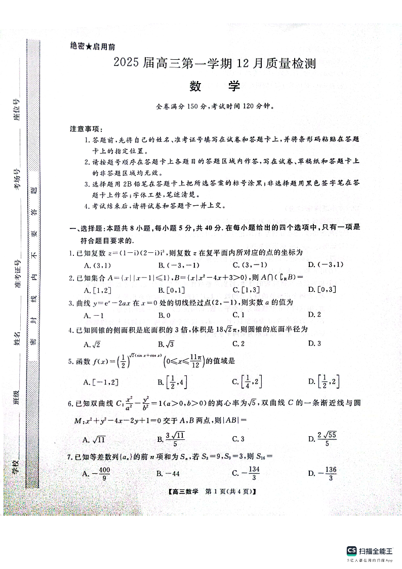 河南省华师联盟2025届高三第一学期12月质量检测数学
