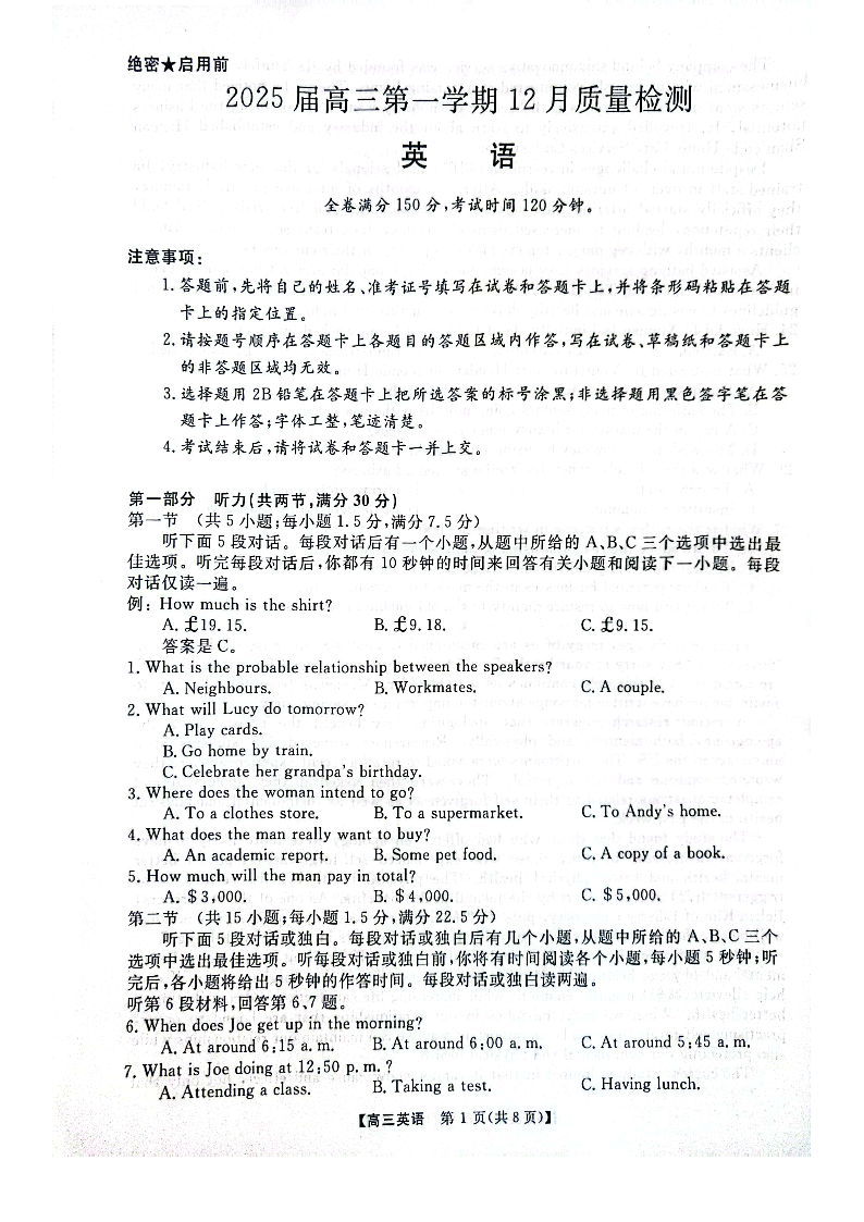 河南省华师联盟2025届高三第一学期12月质量检测英语
