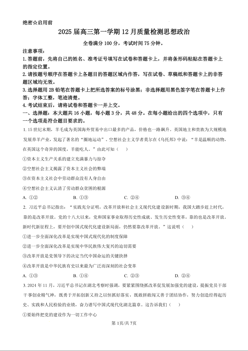 河南省华师联盟2025届高三第一学期12月质量检测政治(原卷版)