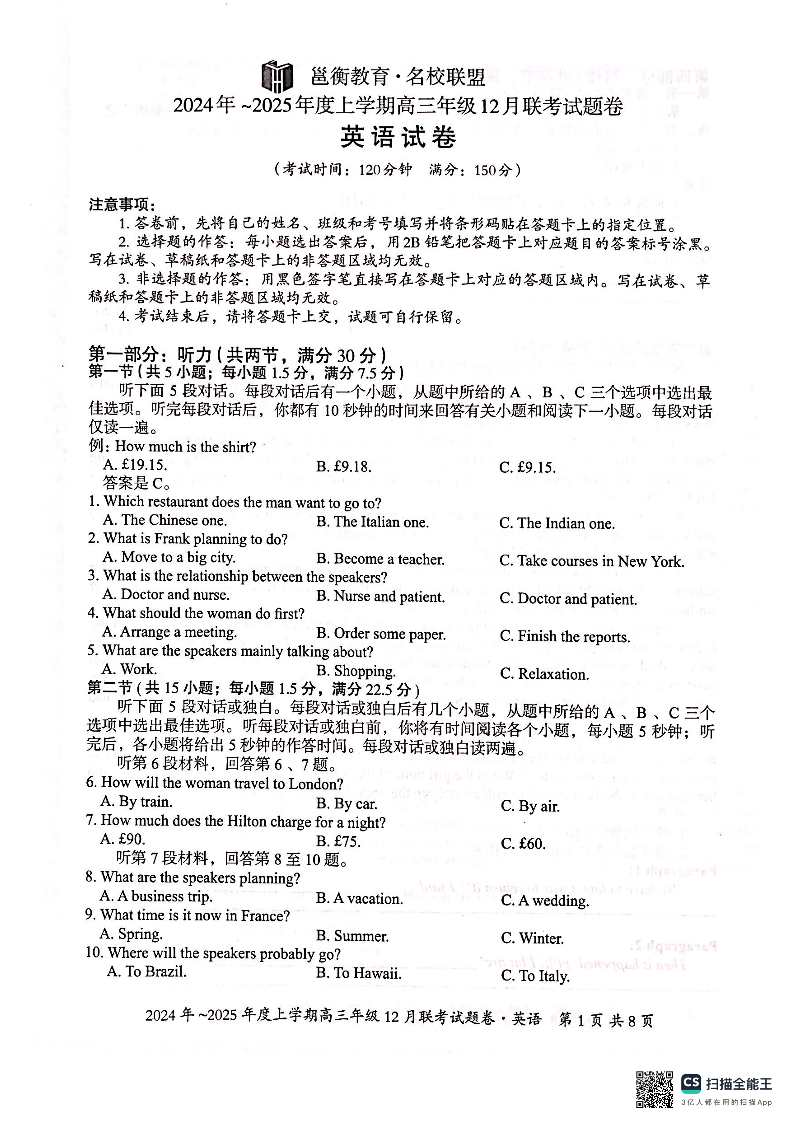 广西省邕衡教育•名校联盟2025届高三上学期12月联考英语