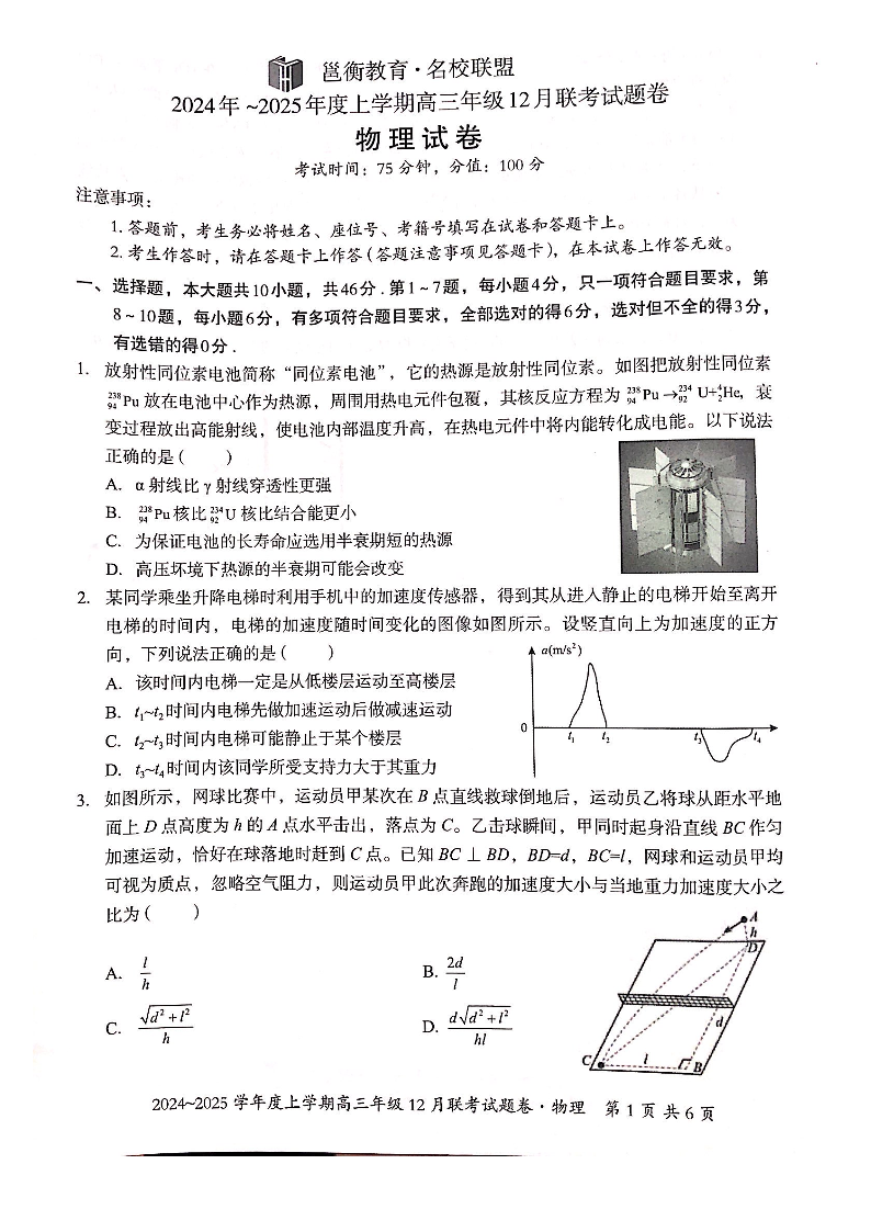 广西省邕衡教育•名校联盟2025届高三上学期12月联考物理