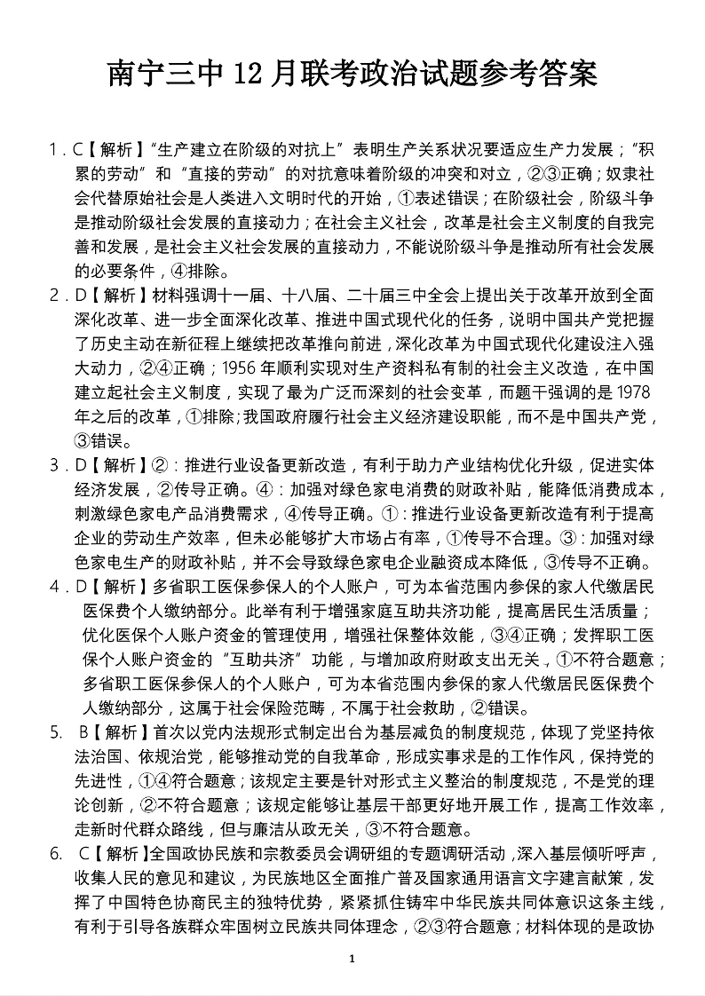 广西省邕衡教育•名校联盟2025届高三上学期12月联考政治答案
