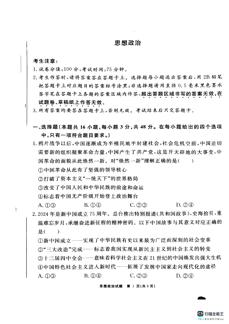 安徽省师大附中等名校2025届高三年级12月阶段性联考检测政治