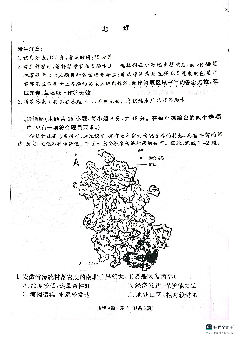 安徽省师大附中等名校2025届高三年级12月阶段性联考检测地理