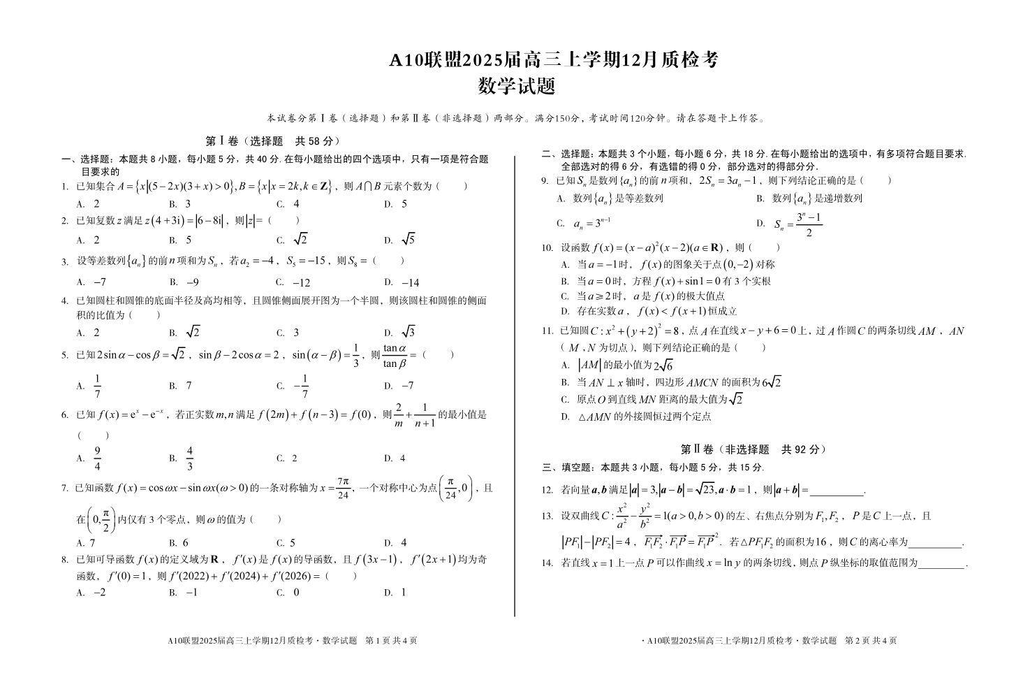 安徽省A10联盟2024-2025学年上学期高三年级12月联考数学+答案