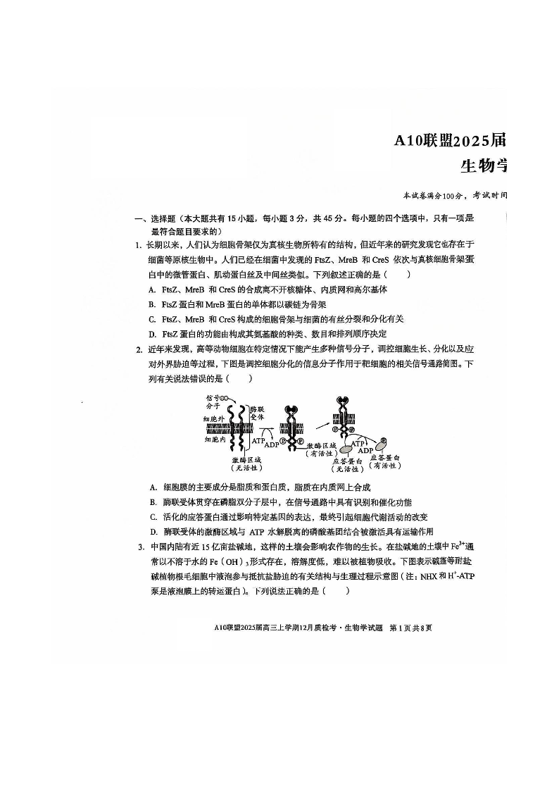 安徽省A10联盟2024-2025学年上学期高三年级12月联考生物