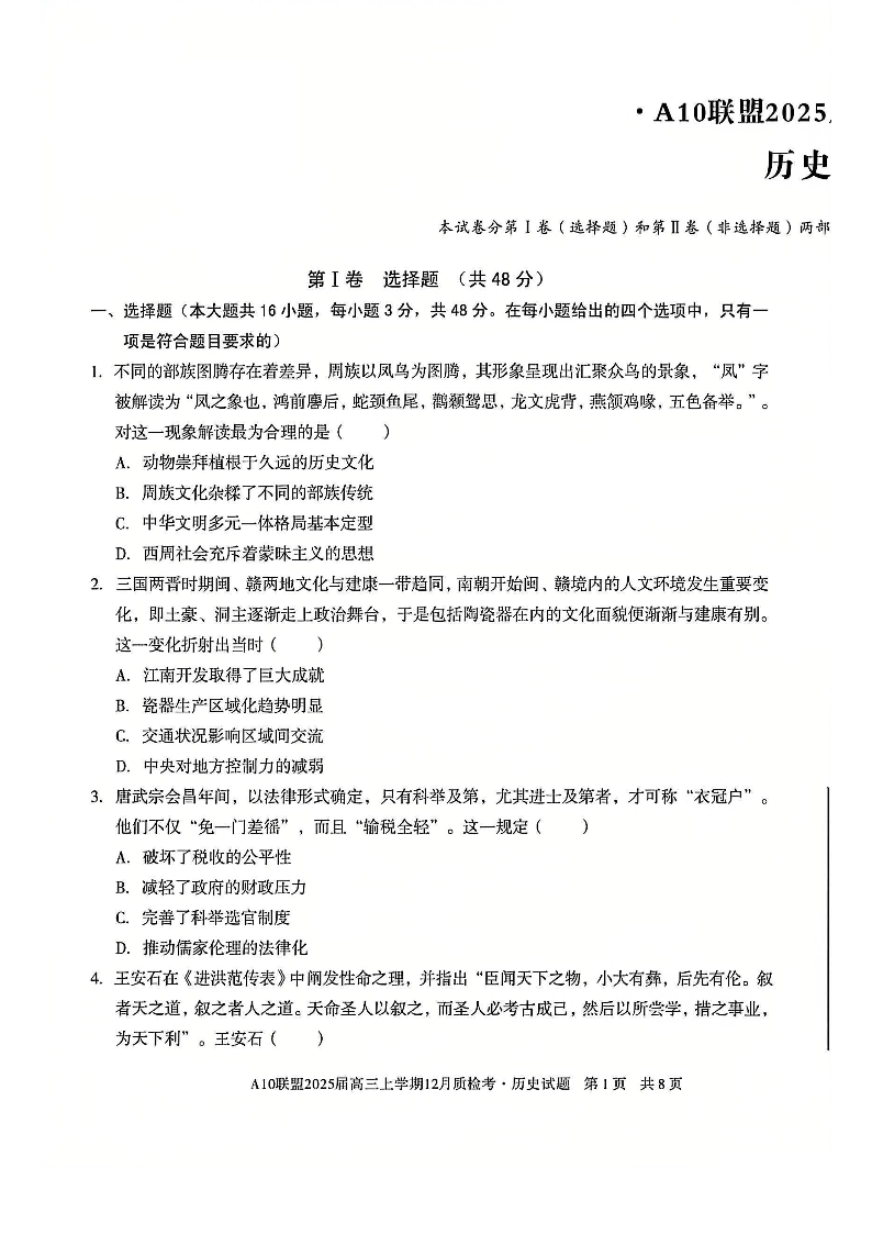 安徽省A10联盟2024-2025学年上学期高三年级12月联考历史+答案