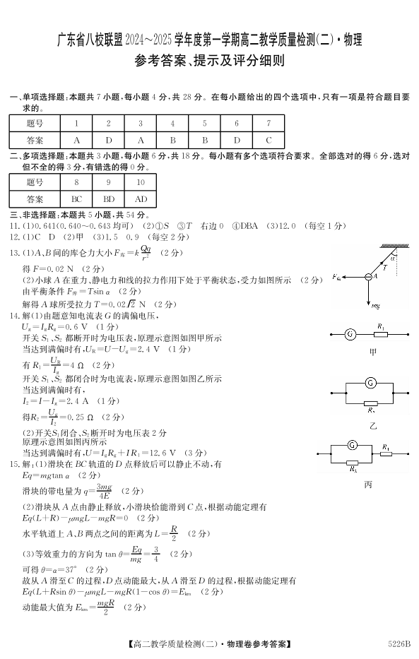广东省八校联盟2024-2025学年高二上学期教学质量检测(二)物理答案