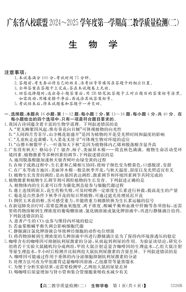 广东省八校联盟2024-2025学年高二上学期教学质量检测(二)生物学