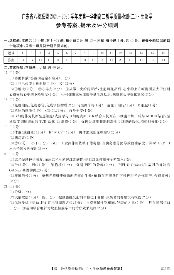广东省八校联盟2024-2025学年高二上学期教学质量检测(二)生物学答案