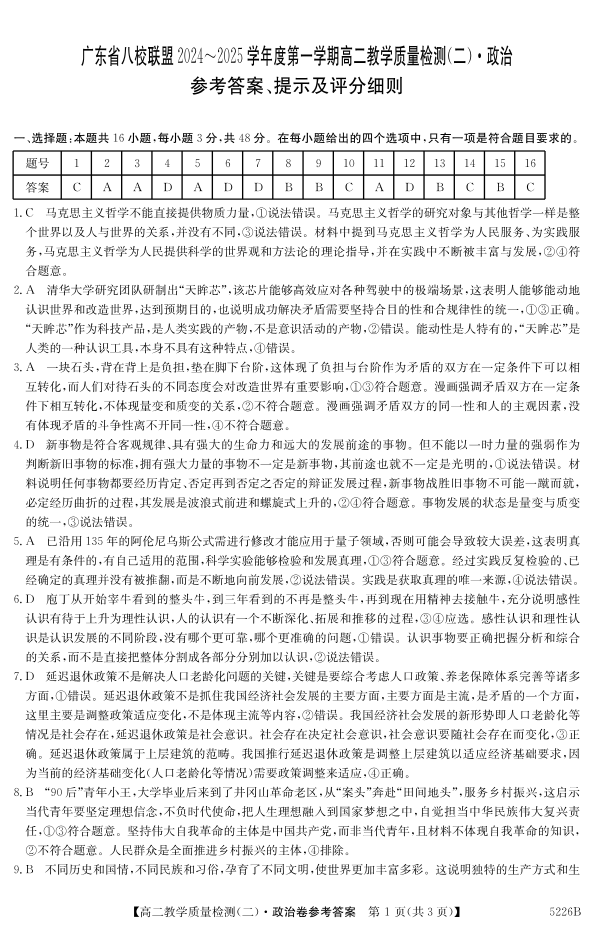 广东省八校联盟2024-2025学年高二上学期教学质量检测(二)政治答案