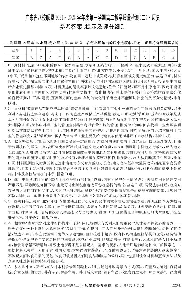 广东省八校联盟2024-2025学年高二上学期教学质量检测(二)历史答案