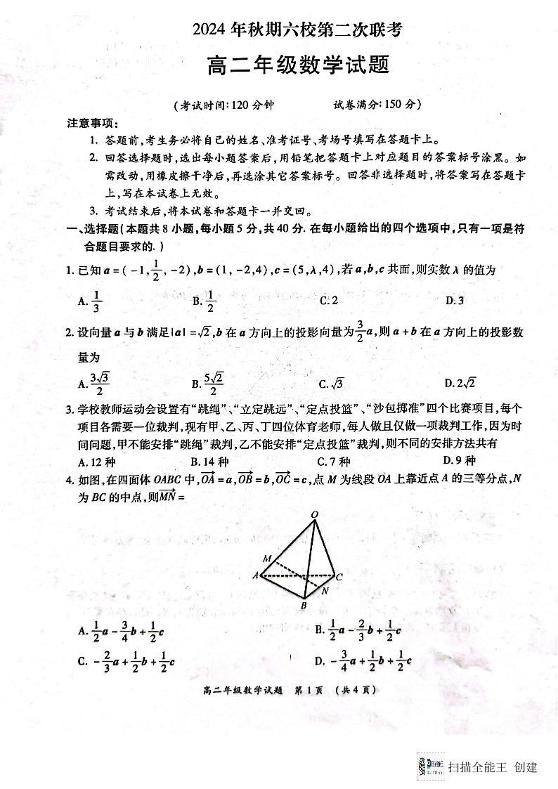 河南省南阳市2024年秋期高二年级六校第二次联考数学