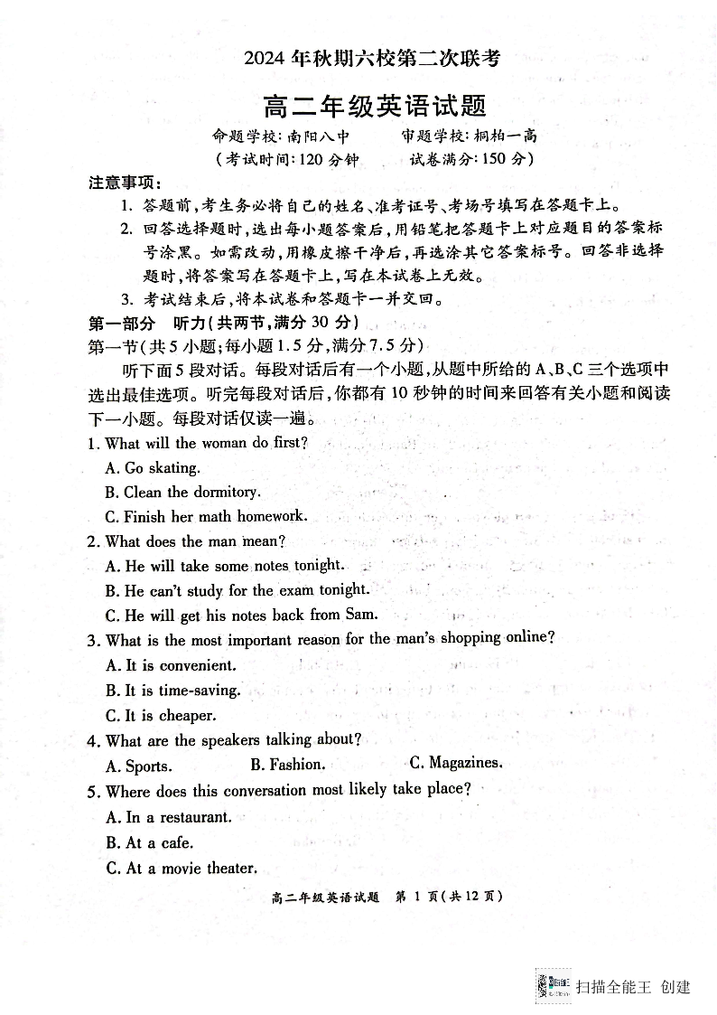 河南省南阳市2024年秋期高二年级六校第二次联考英语