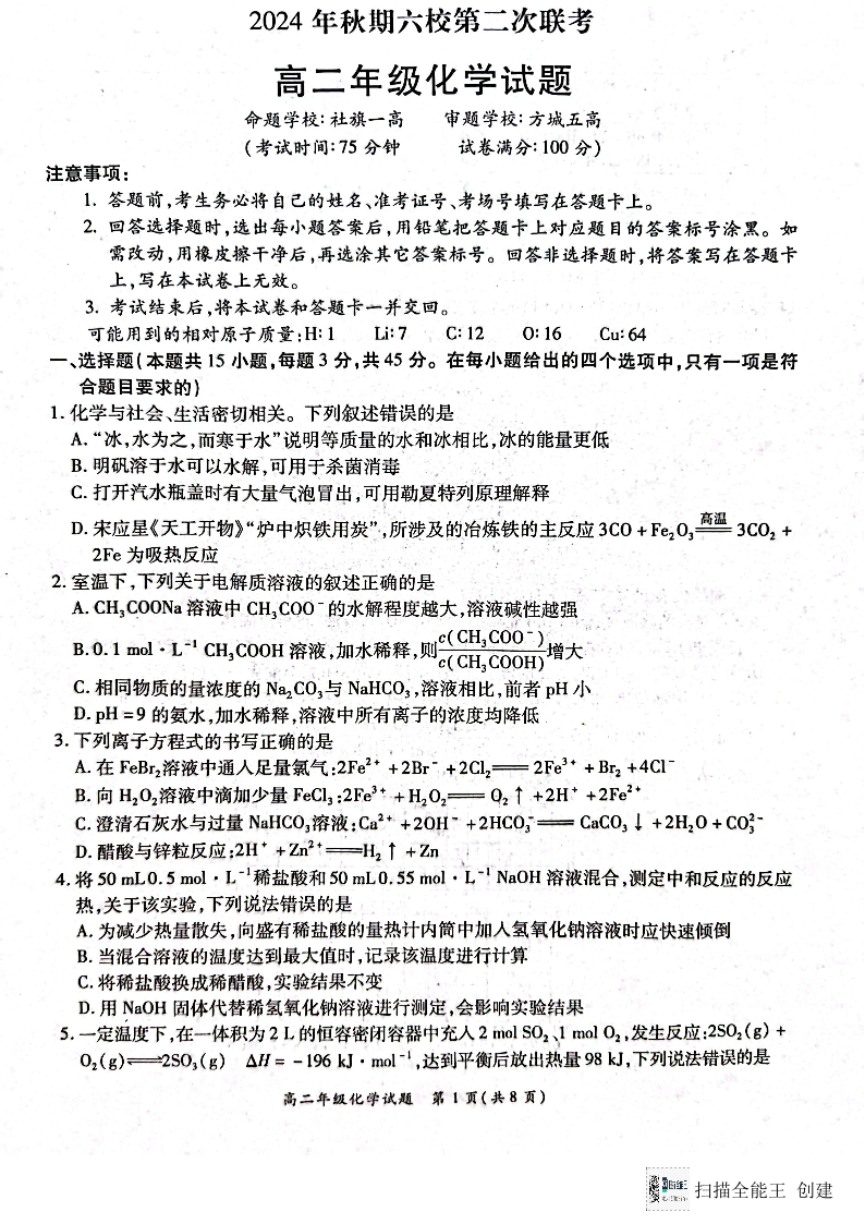 河南省南阳市2024年秋期高二年级六校第二次联考化学