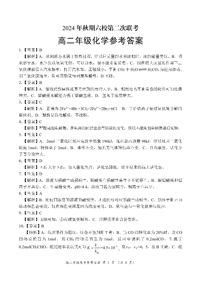 河南省南阳市2024年秋期高二年级六校第二次联考化学答案
