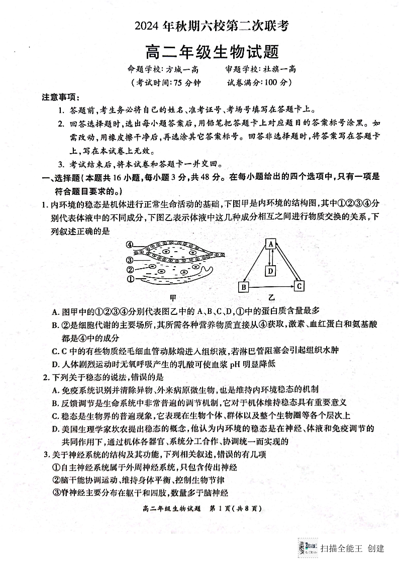 河南省南阳市2024年秋期高二年级六校第二次联考生物