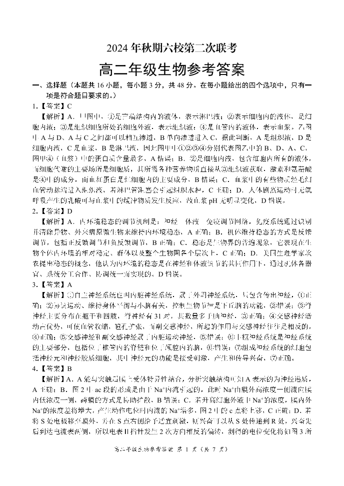 河南省南阳市2024年秋期高二年级六校第二次联考生物答案