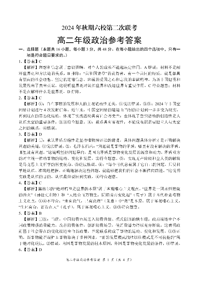 河南省南阳市2024年秋期高二年级六校第二次联考政治答案