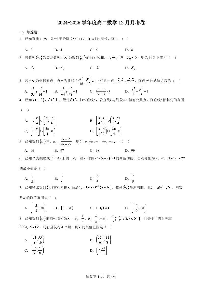 江苏省扬州中学2024-2025学年高二上学期12月月考数学+答案