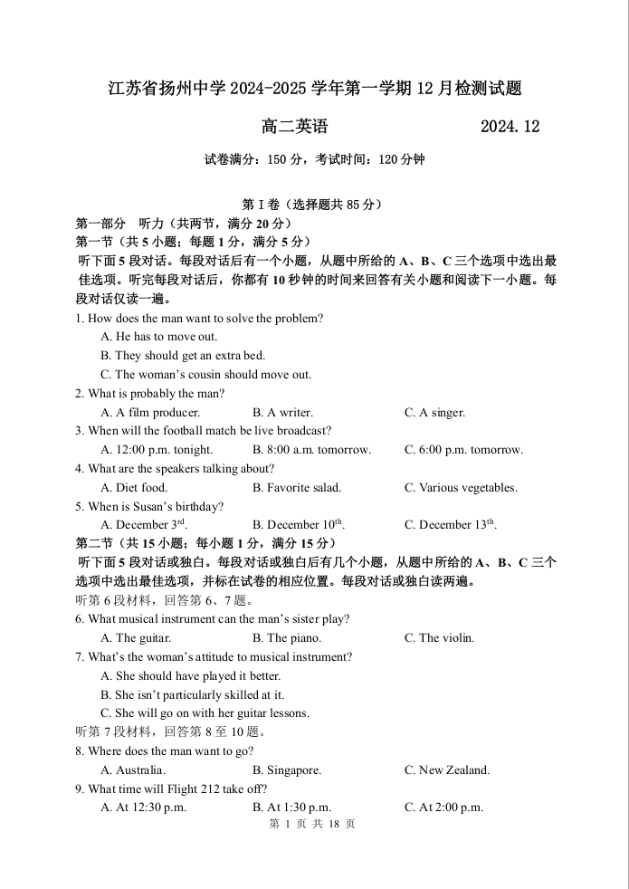 江苏省扬州中学2024-2025学年高二上学期12月月考英语+答案