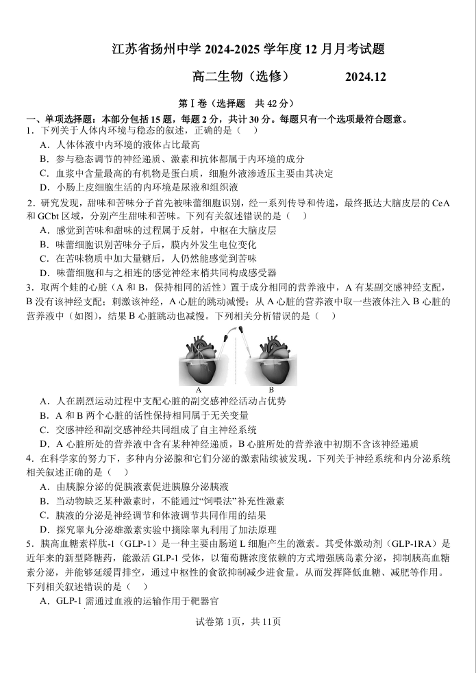 江苏省扬州中学2024-2025学年高二上学期12月月考生物+答案